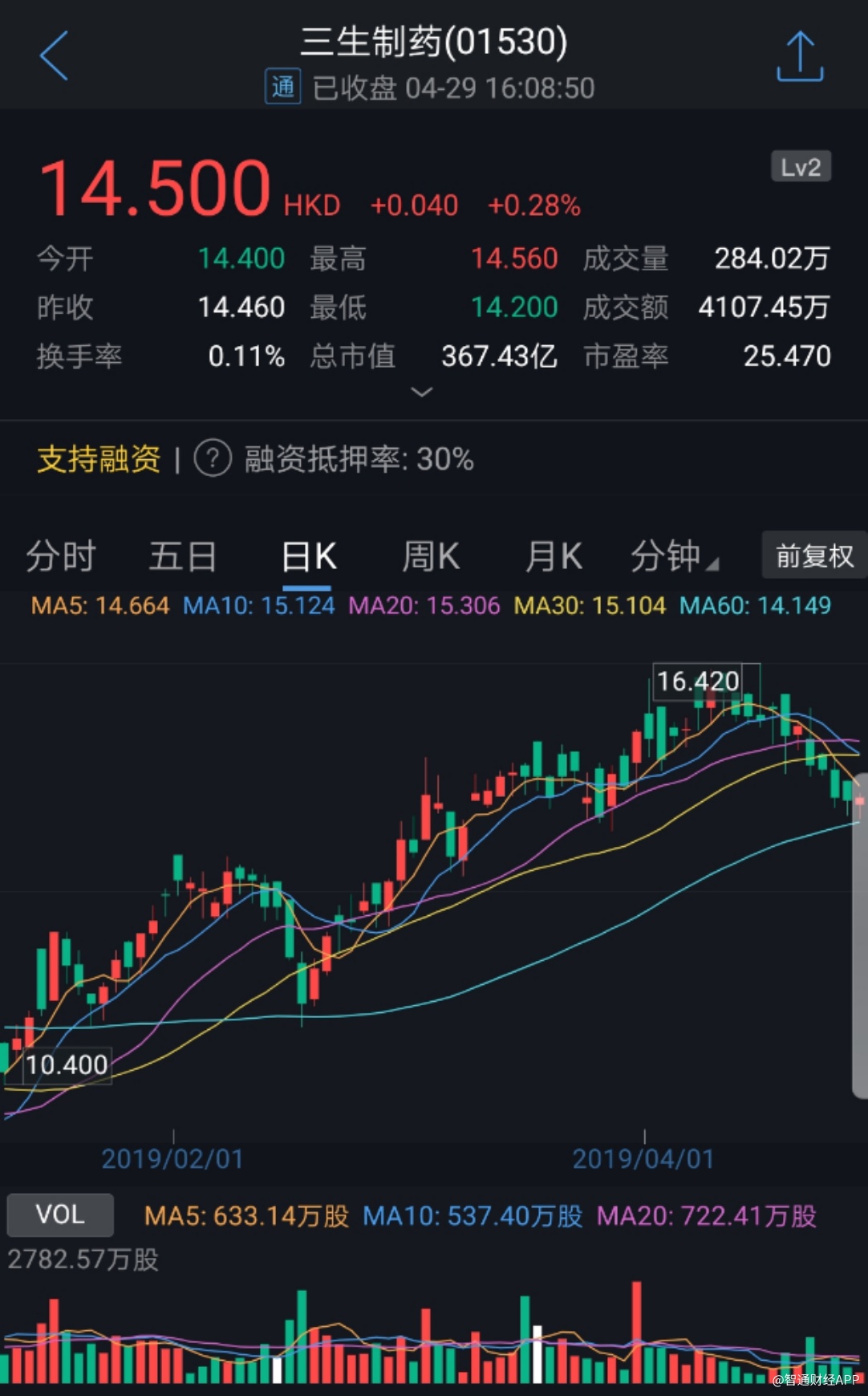 截至今日收盘,三生制药(01530)收涨0.28%,报14.50港元。