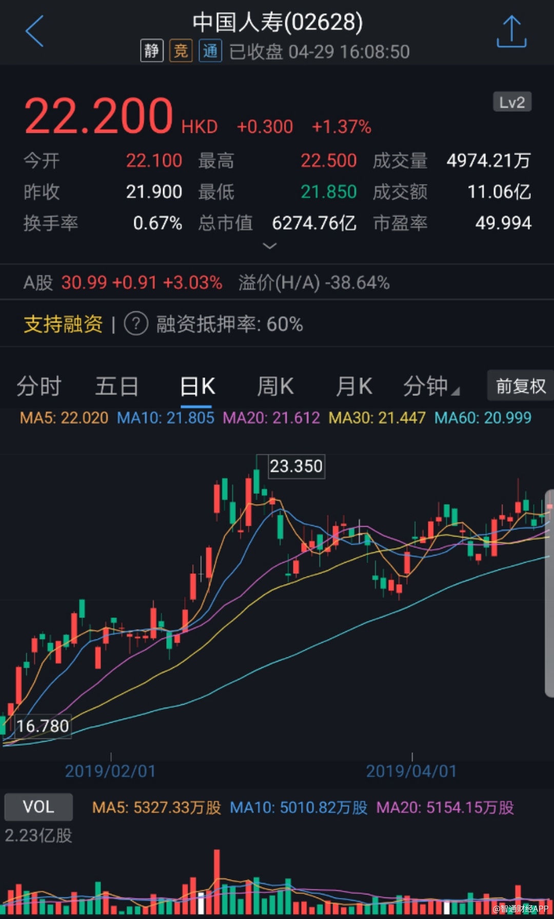 截至今日收盘,中国人寿(02628)收涨1.37%,报22.20港元。