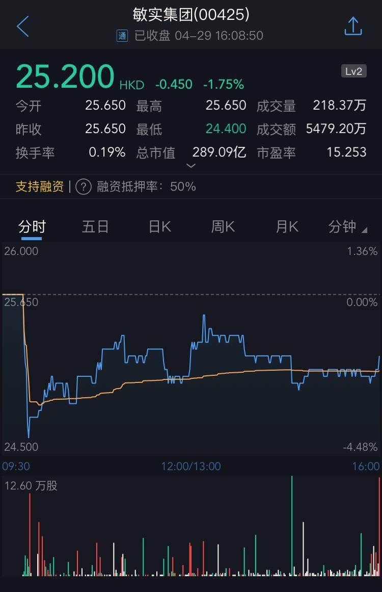 截至今日收盘,敏实集团(00425)收跌1.75%,报25.2港元。