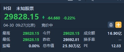 智通财经APP获悉,恒生指数开盘跌0.22%,报29828.15点。国企指数跌0.35%,报11597.1点。红筹指数跌0.05%,报4618.16点。大市盘前成交16.9亿港元。昨夜美股收市全线做好,港股ADR指数全日窄幅上落。