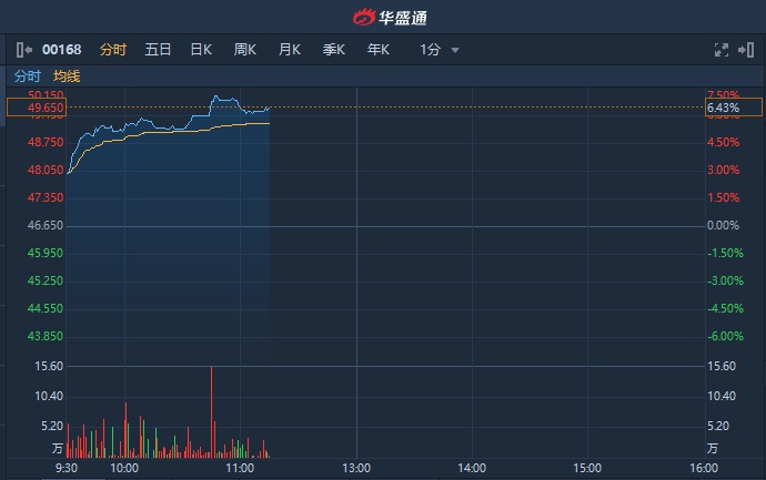 智通财经APP获悉,青岛啤酒(00168)早盘稳步走升,涨幅现时扩大至6%,报49.65港元,成交额达1.052亿港元。