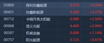智通财经APP获悉,光伏板块今日逆市走强,截至发稿,保利协鑫(03800)涨5.56%,协鑫新能源(00451)涨3.57%,信义光能(00968)涨2.06%,阳光能源(00757)涨0.81%。