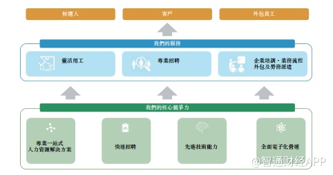公司的营运通过提供人力资源解决方案为客户增加价值,改善客户用过程序,有效派遣合适的外包员工,从而降低流失率;求职者亦可获益于本公司创新的O2O方法,同时线上及线下资源,旨在最大限度提高求职者获聘用的机会。根据灼识咨询的数据,截止2019年3月,公司的平台约有135000名月度活跃用户及超过20000次每日的访问量。公司拥有自主研发的招聘平台及先进的一体化人力资源生态系统,可满足主要业务营运的需求。