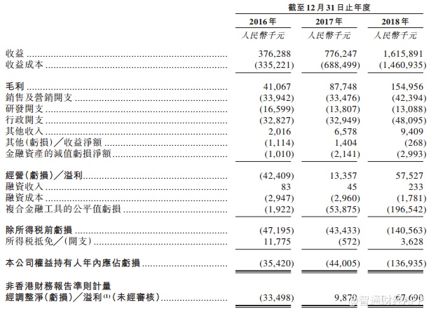 招股书显示,2016年至2018年,公司的收益分别为3.76亿元、7.76亿元及16.16亿元;毛利分别为4106.7万元、8774.8万元及1.55亿元;净利分别为负3349.8万元、987万元及6769万元。