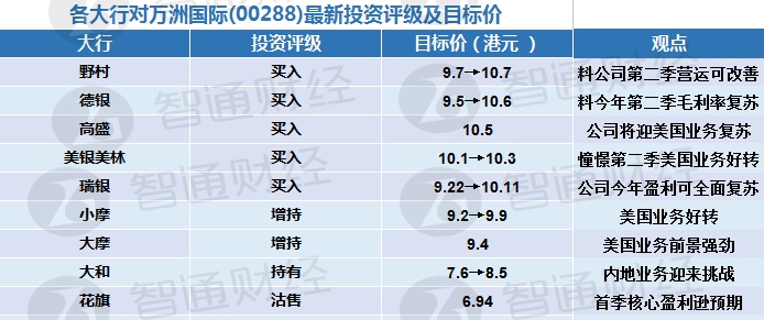 各大行对万洲国际最新投资评级及目标价如下图所示: