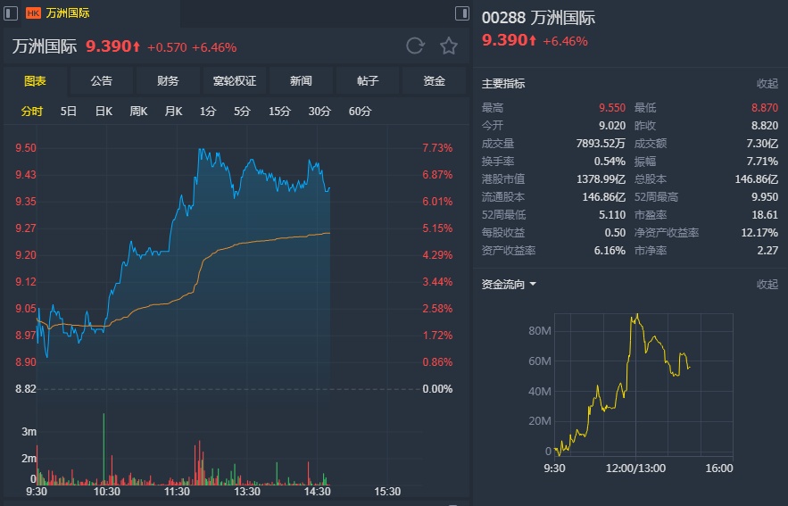 智通财经APP获悉,万洲国际(00288)今早股价受追捧,抽高曾逾8.3%,盘中一度高见9.55港元,市场憧憬公司旗下美国业务第二季营运将可好转,将会带动公司今年营运表现。公司昨收市后公布,今年首季生物公允价值调整前收入按年跌6%至52.82亿美元,经营利润减少10%至3.4亿美元,纯利跌21.3%至1.96亿美元。每股盈利1.34美仙。
