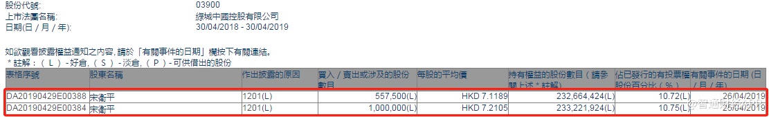 智通财经APP获悉,根据联交所资料显示,宋卫平于4月25日及26日分别减持绿城中国(03900)100万、55.75万股,每股作价分别为7.21、7.12港元,总值约1117.94万港元,最新持股数目2.33亿股,最新持股比例为10.72%。