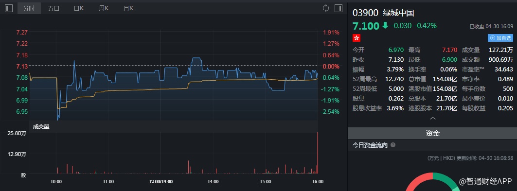截至今日收盘,绿城中国(03900)收跌0.42%,报7.10港元。