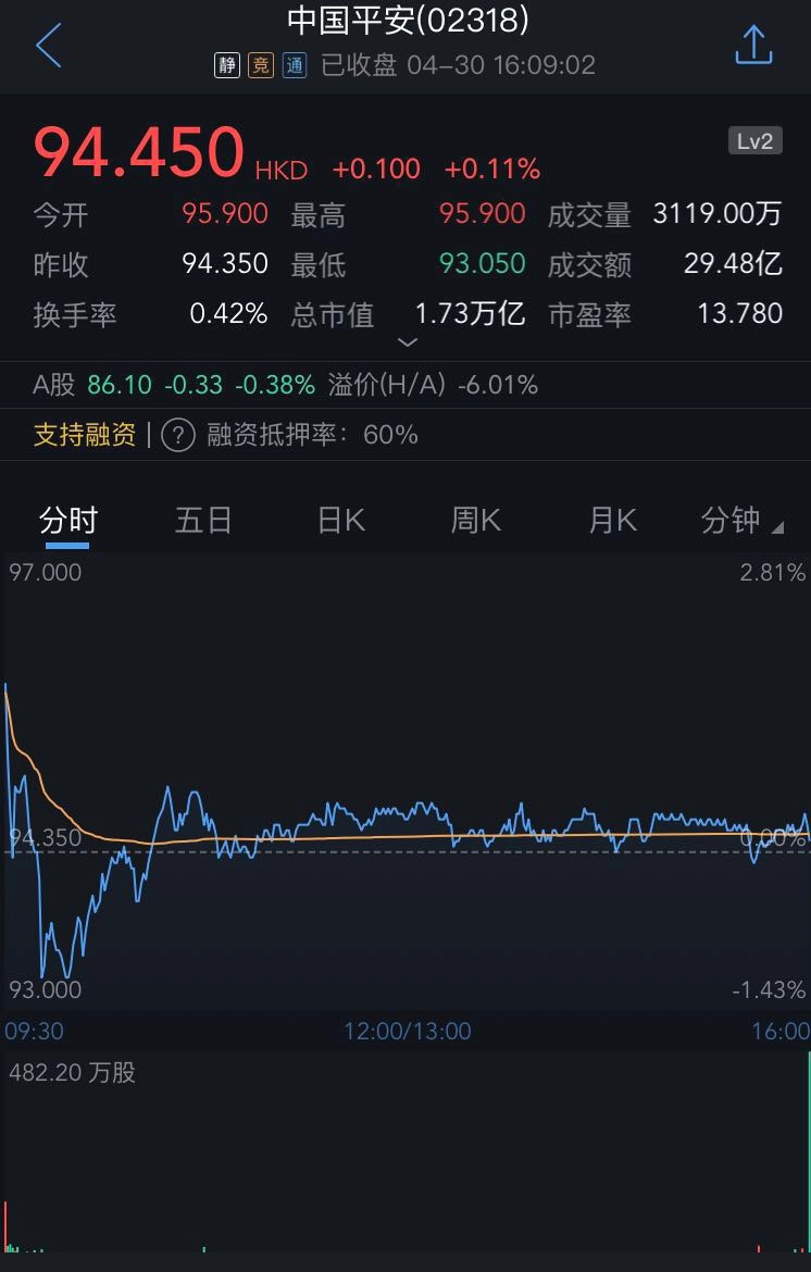 截至今日收盘,中国平安(02318)收涨0.11%,报94.45港元。