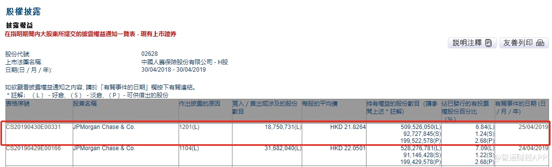 智通财经APP获悉,根据联交所资料显示,摩根大通于4月25日减持中国人寿(02628)1875万股,每股作价21.82港元,总值约4.09亿港元,最新持股数目约5.09亿股,最新持股比例为6.84%。