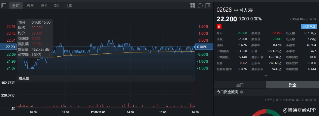 截至今日收盘,中国人寿(02628)报22.20港元,与上一个交易日持平。