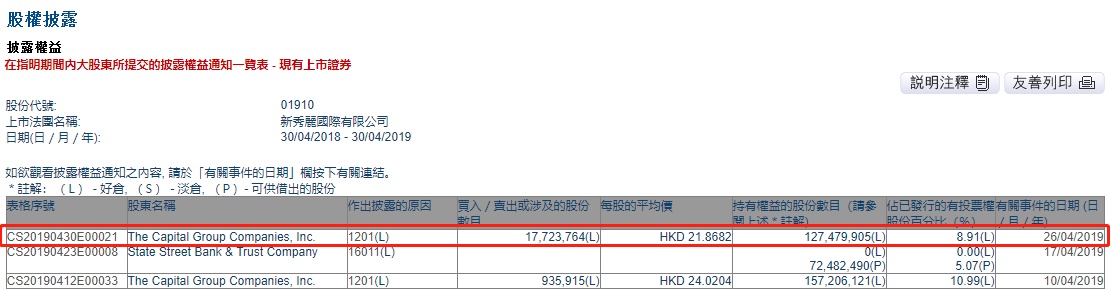 智通财经APP获悉,根据联交所资料显示,The Capital Group于4月25日减持新秀丽(01910)1772万股,每股作价21.87港元,总值约3.88亿港元,最新持股数目约1.27亿股,最新持股比例为8.91%。