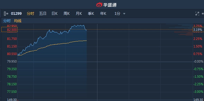 智通财经APP获悉,友邦保险(01299)盘中高见82.9港元,刷新历史高位,市值逼近万亿港元。截至11时39分,涨3.19%,报价82.5港元,贡献指数91点,成交额10.49亿。