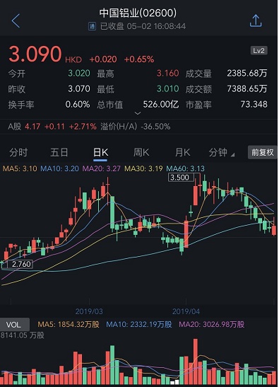 截至今日收盘,中国铝业(02600)升0.65%,报3.09港元。