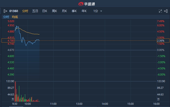 智通财经APP获悉,特步(01368)早盘股价高开低走,一度升逾5%,截至10时26分,涨2.36%,报4.78港元,成交额达6847万港元。