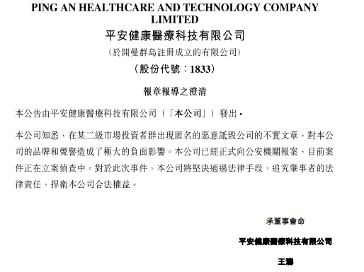 摩根大通在研报中表示,平安好医生于5月2日发布公告,并召开投资人电话会,提供其最新业务情况,同时回应此前市场上出现的匿名不实文章。根据公告,针对近期出现的匿名不实文章,平安好医生已正式向公安机关报案,目前案件正在立案侦查中。对于此次事件,平安好医生将坚决通过法律手段,追究肇事者的法律责任,捍卫公司的合法权益。