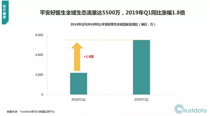 事实上,在知名的移动互联网大数据监测平台Trustdata大数据于4月26日发布的《2019年一季度中国互联网行业发展分析报告》中,平安好医生在流量端依旧保持着迅猛的增长势头。数据显示,2019年一季度,平安好医生全域生态流量达5500万,环比增长1.8倍。
