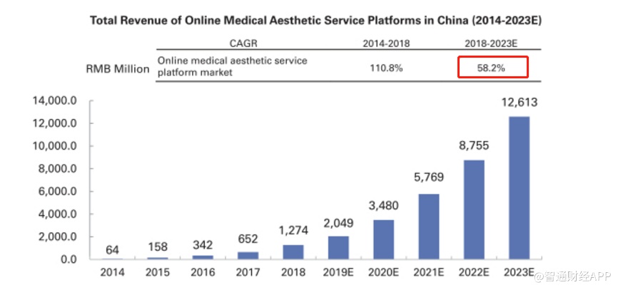 据弗若斯特沙利文数据显示,2018年医美服务行业总收入规模达到1217亿元人民币,预计2023年时可到3601亿元人民币,年均复合增长率达到24.2%,医美仍是一个快速发展的行业。