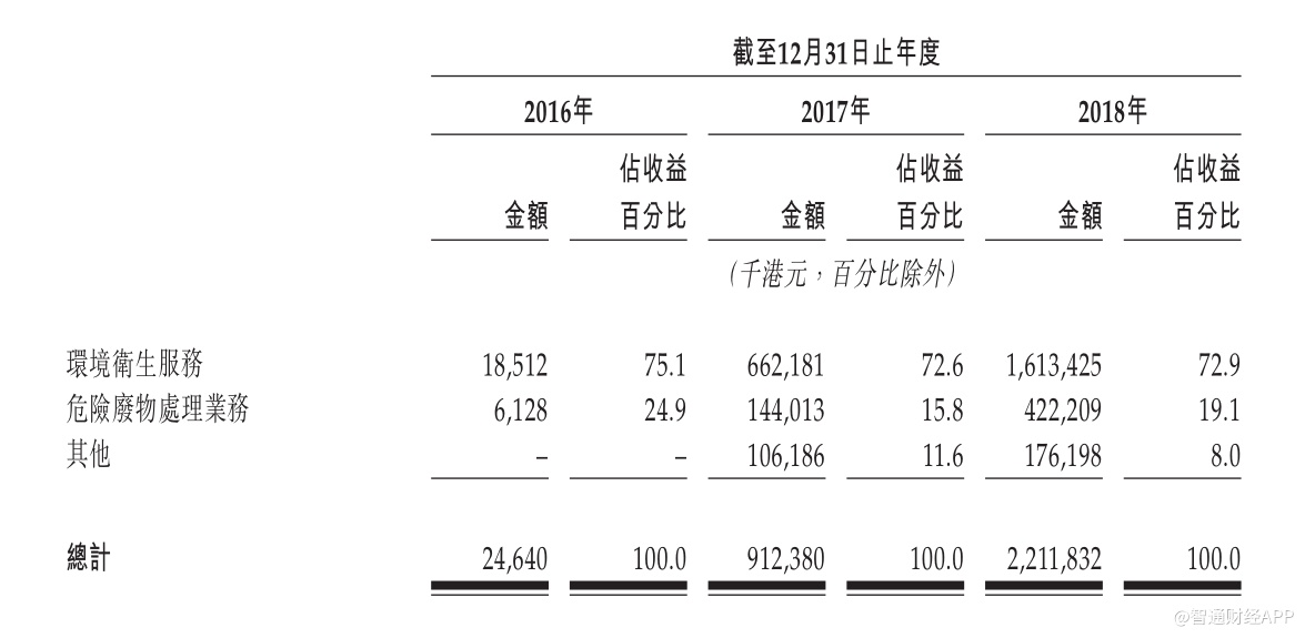 于往绩记录期间,环境卫生服务为集团的主要业务分部,分别占截至2016年、2017年及2018年12月31日止年度收益约75.1%、72.6%及72.9%。于往绩记录期间,集团也会根据BTO模式运营的环境卫生服务项目(包括昆明市西山区项目及务川县城乡生活垃圾收运项目)有关的已提供建造服务产生收益,集团的环境卫生服务收益由2016年的1850万港元大幅增加至2017年的6.6亿港元,并进一步增加至2018年的16亿港元,复合年增长率达约833.6%。