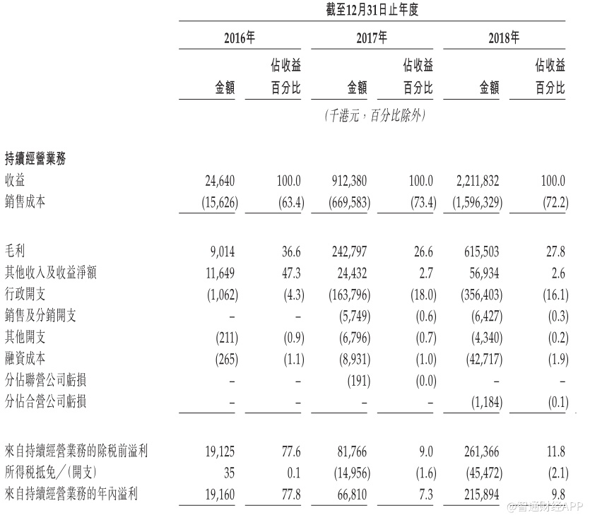 截至2016年、2017年及2018年12月31日止年度,集团持续经营业务的收入分别为2464万港元、9.1亿港元及22亿港元。于2016年、2017年及2018年,集团持续经营业务的纯利分别为1900万港元、6681万港元及2.1亿港元。
