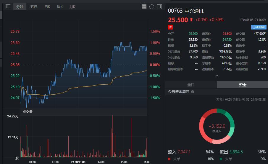 截至今日收盘,中兴通讯(00763)涨0.59%,报25.50港元。