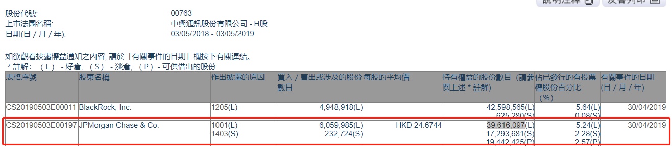 智通财经APP获悉,根据联交所资料显示,摩根大通于4月30日增持中兴通讯(00763)605万股,每股作价24.67港元,总值约1.49亿港元,最新持股数目约3962万股,最新持股比例为5.24%。