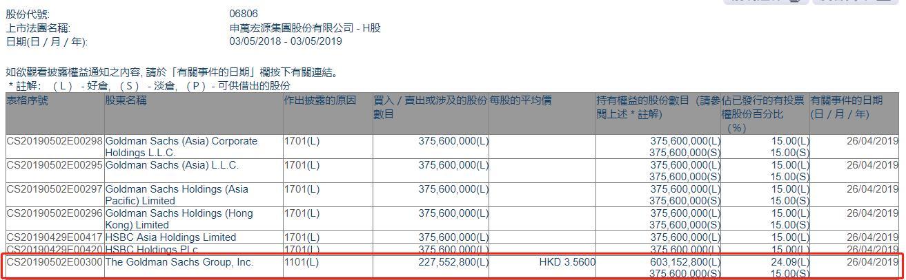 智通财经APP获悉,根据联交所资料显示,高盛于4月26日增持申万宏源(06806)2.27亿股,每股作价3.56港元,总值约8.08亿港元,最新持股数目约6.03亿股,最新持股比例为24.09%。