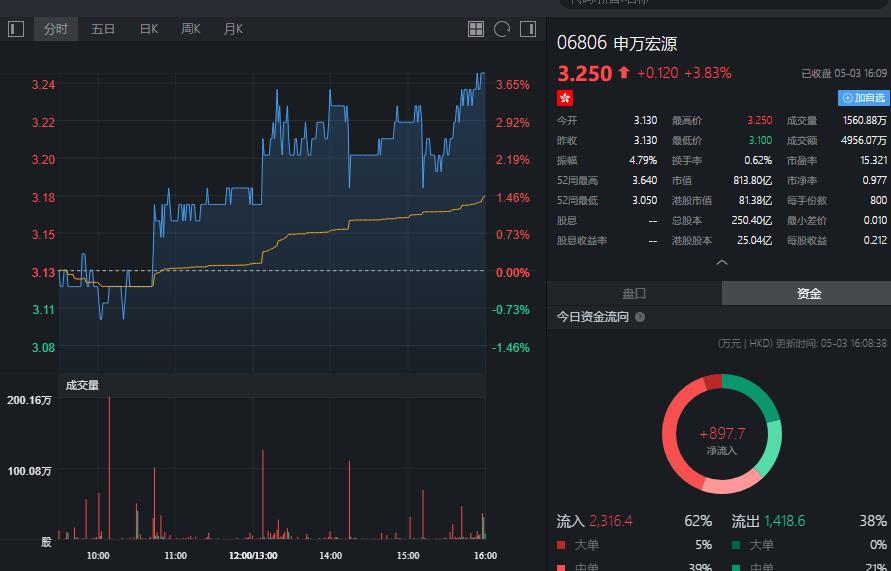 截至今日收盘,申万宏源(06806)涨3.83%,报3.25港元。