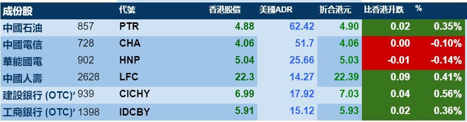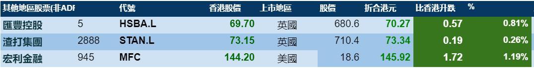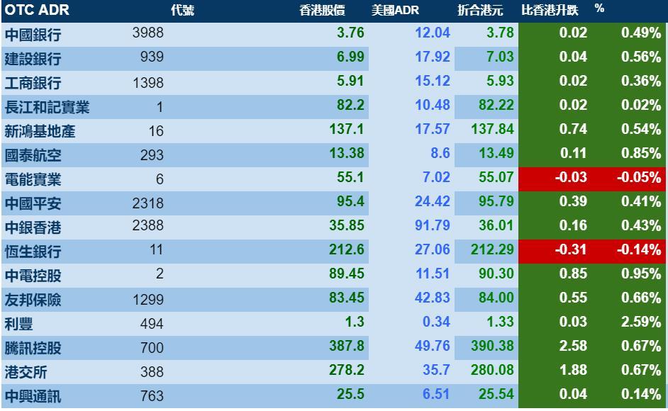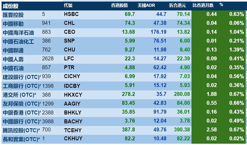 周四美股开始上扬,港股ADR指数也随之走强,按比例计算,收报30231点,升150.24点。汇丰控股收报70.14元,较港收市涨0.44元;腾讯控股收报390.28元,较港股收市涨2.58元。
