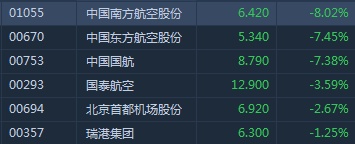 智通财经APP获悉,受汇率影响,航空股全线重挫。截至9时35分,南航(01055)跌8.02%,报价6.42港元,东航(00670)跌7.45%,国航(00753)跌7.38%,国泰航空(00293)跌3.59%,首都机场(00694)跌2.67%。