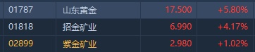 智通财经APP获悉,港股三大股指早盘下挫,跌幅均超2%,市场情绪跌至冰点,盘面上仅黄金板块飘红,截至发稿,山东黄金(01787)涨5.8%,招金矿业(01818)涨4.17%,紫金矿业(02899)涨1.02%。
