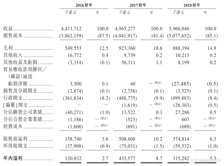 于往绩记录期间,集团在2016财年、2017财年及2018财年的收益分别为44亿港元、49亿港元及59亿港元,于相关年度的净溢利为1.2亿港元、4.33亿港元及3.15亿港元。