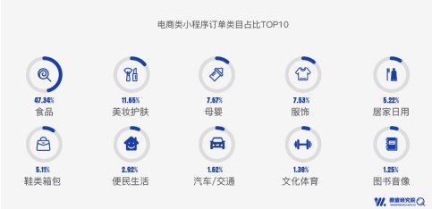 在电商行业,小程序用户偏爱低价商品,20元以下订单支付人数占比达37.54%;订单占比前十的类目分别是:食品、美妆护肤、母婴、服饰、居家日用、鞋类箱包、便民生活、汽车/交通、文化体育、图书音像。微盟研究院认为,低价食品类目的商品更易引爆销量。此外,相较于男性用户,女性用户使用电商类小程序更多,订单占比达到74.72%,远高于男性的25.28%,支付金额占比为55.41%,男性占比44.59%,表明女性更爱“买买买”,男性客单价更高。