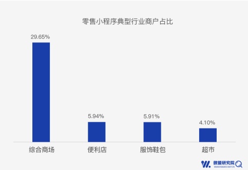 在零售行业,综合商场、便利店、服饰鞋包以及超市四大零售业态对小程序的应用最多,其中综合商场占比最高,达29.65%。这表明,综合商场对智慧零售升级需求较高。