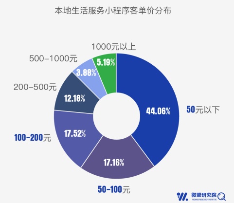 本地生活服务行业中,上海、北京、江苏三地的门店小程序数量最多。同时,本地生活小程序的客单价多分布在200元以下,占比近八成,其中50元以下订单达到44.06%。