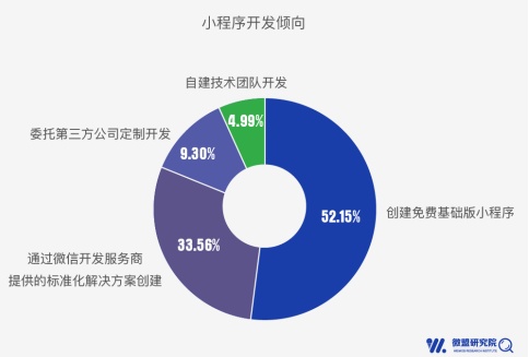 《2018微信影响力报告》指出,微信小程序主体中,民营企业和中小微企业占比分别达到了69%和73%。根据微盟研究院的调查,企业在选择小程序开发方式上,也更加倾向免费或少付费。商户开通微信小程序,主要有几种途径:通过微信官方提供的免费方式开通基础版本小程序、借助第三方服务商提供的解决方案创建功能完备的小程序、通过第三方开发公司做定制化开发或者自建开发团队。在微盟研究院的调查中,52.15%的商户选择免费创建基础版小程序,而在付费开发的方式中,借助第三方服务商提供的解决方案创建功能完备的小程序成为企业商户的首选,占比33.56%。