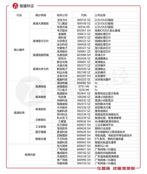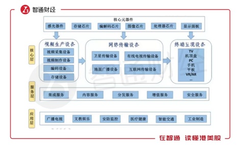 智通财经APP了解到,核心层是提供硬件设备的生产制造,涉及视频生产设备、网络传输设备、终端呈现设备及其相关核心元器件;服务层是提供面向超高清视频的平台服务;应用层为超高清视频与各行业融合应用形成的新模式新业态。