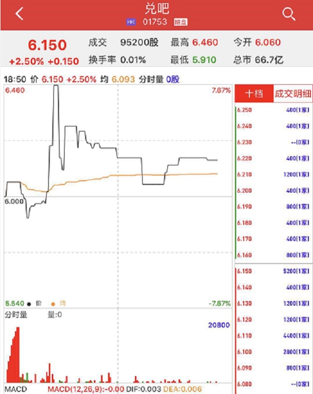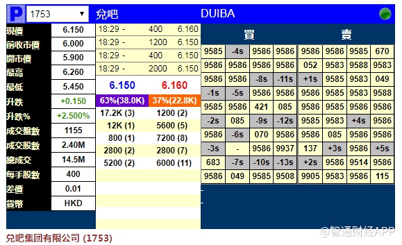 智通财经APP获悉,兑吧集团(01753)将于5月7日挂牌,上市前夕,其暗盘收报6.15港元,较招股价6港元,涨2.5%。每手400股,不计手续费,每手赚60港元。