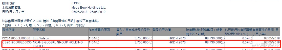 智通财经APP获悉,根据联交所资料显示,NOAHS GLOBAL GROUP HOLDING LT于5月2日增持MEGAEXPO(01360)375万股,每股作价4.27港元,总值1601.25万港元,最新持股数目8873万股,最新持股比例为6.07%。