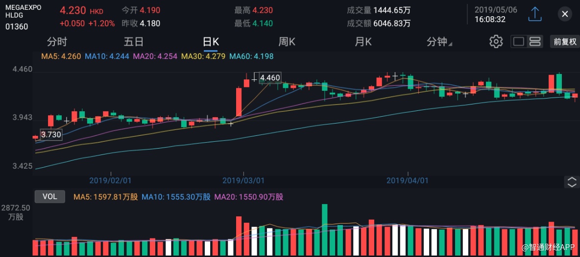 截至今日收盘,MEGAEXPO(01360)涨1.20%,报4.23港元。