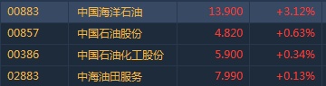 智通财经APP获悉,受国际油价走高影响,港股石油股早盘全线高开。截至9时45分,中海油(00883)涨3.12%,中石油(00857)涨0.63%,中石化(00386)涨0.34%。