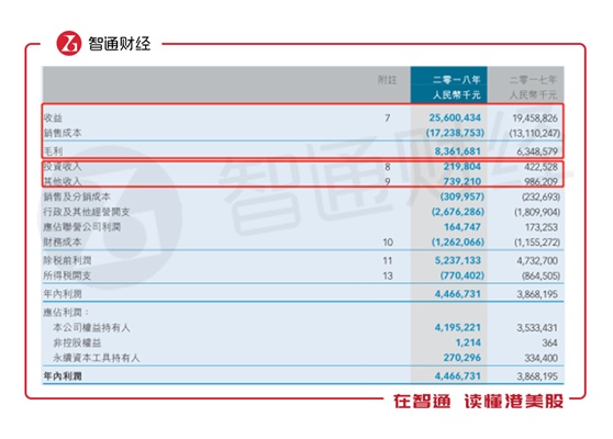 主营业务盈利能力大幅提升。智通财经APP翻看公司利润表时发现,公司非主营业务的投资、其他收入两项,2018年为9.59亿元,较2017年的14.09亿大幅下降31.94%。如果刨除这块,公司2018年主营业务净利润为35.08亿,较2017年的24.59亿元大幅增长42.66%,比31.6%的营收增长高出许多,这意味是公司主营业务盈利能力是大幅提升的。