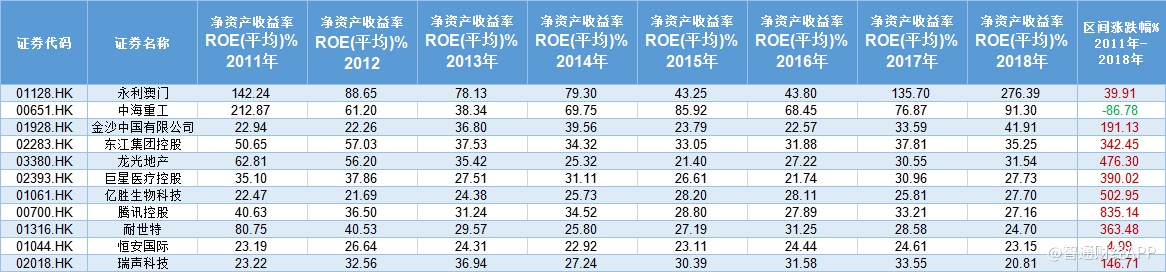 在港股方面,2011年至2018年,在2372家港股上市公司中,仅有11家上市公司ROE连续超过20%,分别为腾讯控股、龙光地产、中海重工、瑞声科技、恒安国际等。据智通财经APP统计,这11家港股上市公司,在2011年至2018年间,股价平均涨幅高达291%,而同期的恒生指数近有12.20%的涨幅。