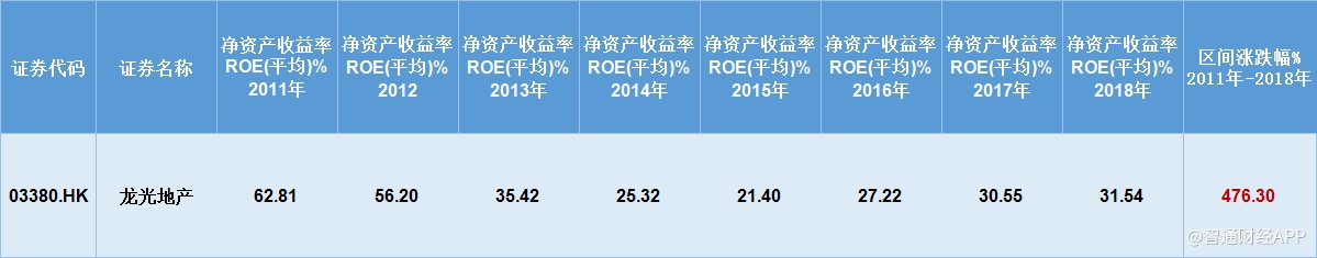 值得关注的是,龙光地产(03380)在2011年至2018年期间,股价表现出众,累计涨幅达476%,成为唯一符合巴菲特ROE选股标准的内房股。