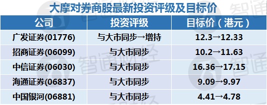 大摩普遍上调券商股目标价,因为年初至今市场条件较预期好,但认为板块进一步上升空间有限,维持行业审慎看法。因广发证券(01776)股本回报较同业强劲,而且估值相对吸引,将其评级由“与大市同步”升至“增持”。