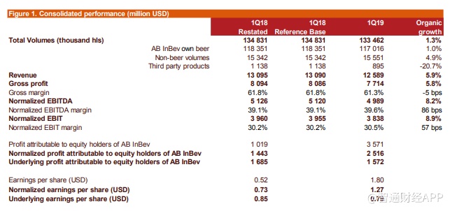 智通财经APP获悉,百威英博(BUD.US)公布2019年第一季度财报,该公司实现收入125.89亿美元,同比增长5.9%;总利润77.14亿美元,同比增长5.8%;调整后EBITDA为49.89亿美元,预估为51亿美元,同比增长8.2%,预期增长8.6%;每股收益为1.27美元,高于2018年第一季度的0.73美元。