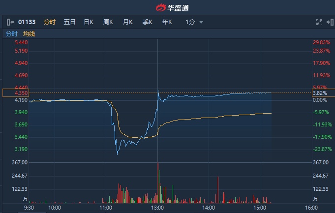 智通财经APP获悉,哈尔滨电气(01133)早盘跳水,一度跌超26%,而后止跌回升并翻红,截至15时12分,涨3.82%,报4.35港元,成交额达2.974亿港元。