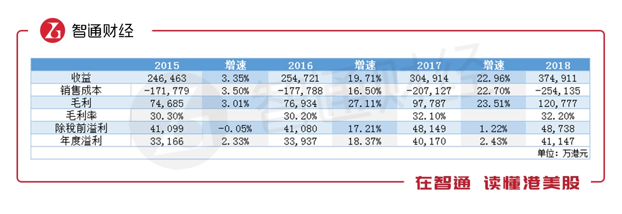 2018年,公司实现收入37.49港元,同比增长22.96%。毛利提升23.51个百分点至12.07亿港元,毛利率微增0.1个百分点。然而,相较23%以上的高毛利增速,公司利润同比仅增长了2.43%。