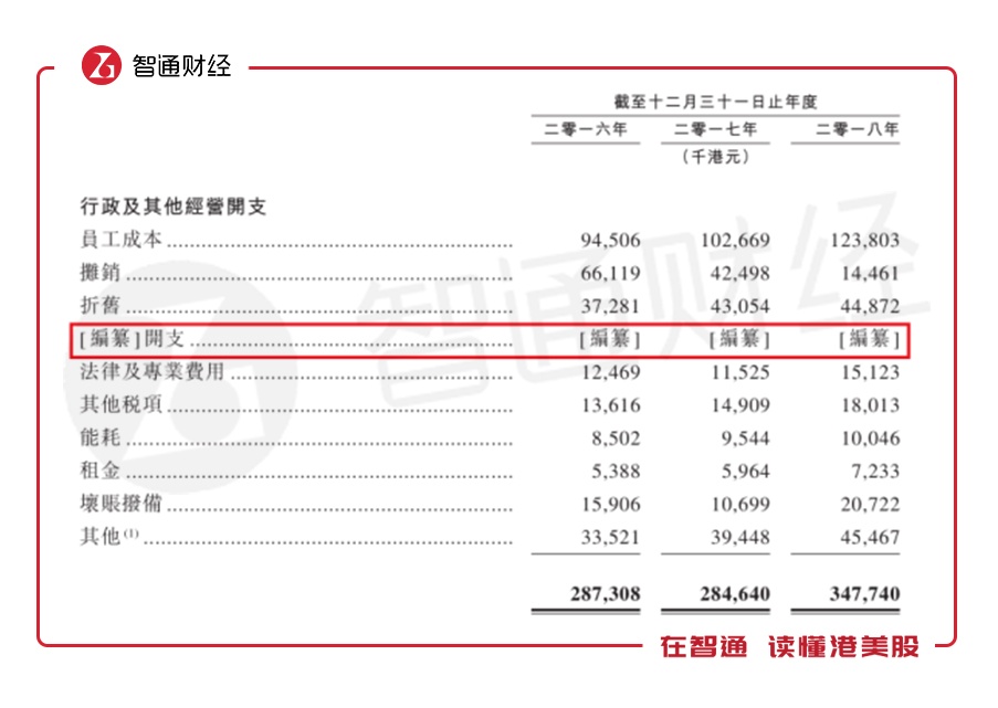 在公司行政及其他经营开支中,还有一项上未标明的开支也对公司行政开支增加有所影响。根据测算,若将下表中整体行政及其他经营开支于其余开支间的差额视为此项未标明的“编纂”开支,则该项开支由2016年为零增长至2017年的433万港元,又于2018年进一步增长至4800万港元,同比增幅1008.55%,成为公司2018年占总行政开支比重第二大的开支,占比达13.80%。