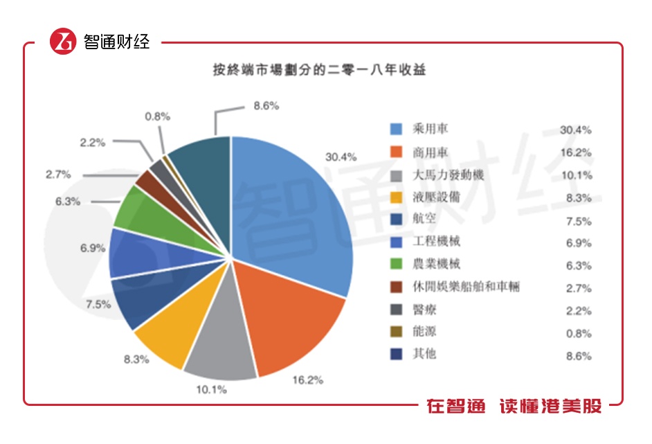 而就终端市场来看,鹰普精密收益前三大终端市场为乘用车、商用车及大马力发动机,2018年收益分别占总收入的比例分别为30.4%、16.2%及10.1%。其中,乘用车、商用车的占比较全年分别下降了2.3及0.3个百分点,大马力发动机则出现了1.6个百分点的增长。